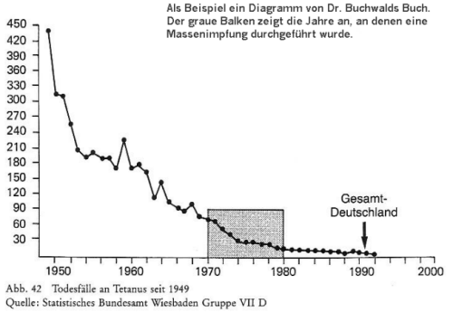 | Tetanus: Mit weit unter 10 Sterbefällen pro Jahr äußerst selten. Da aber höchstens 60% der Bevölkerung einen sogenannten Impfschutz hat, ist hier der Rückgang auf bessere Wundversorgung und vor allem Lebensbedingungen zurückzuführen, wie bei den vorher bereits genannten Krankheiten. An Tetanus Erkrankte erzeugen keine Immunität! |
